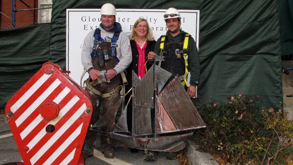 joey – here’s the schooner with a broken mast on top of city hall. the copper model was created by washburn on rt. 114 in 1989 and donated to the city by the cape ann savings bank. this pic was taken just before she was hoisted up to her place of honor. it is, of course, the elsie, built in 1910 by a.d. story in essex. gordon thomas, in fast and able, called her "one of the greatest." if anyone can help bring her down for repairs, step forward! a model of the elsie by cape ann master craftsman erik ronnberg is on display at the cape ann museum. it’s a beautiful thing… infamous fred