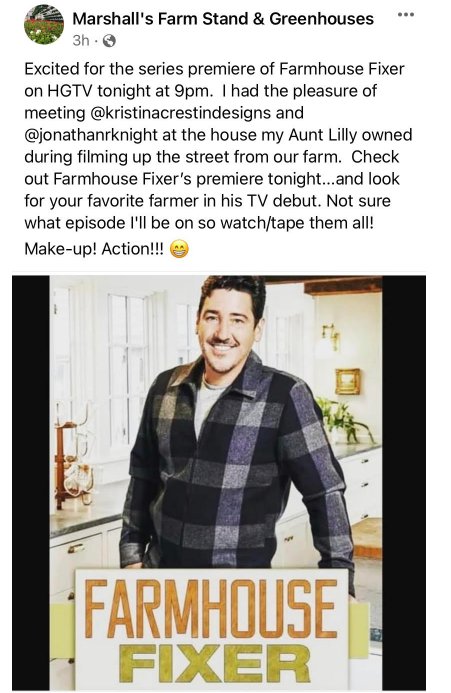 West Gloucester on HGTV! Farmhouse Fixer- new reno show with Jonathan Knight and Kristina Crestin. Look for Bob Marshall’s interview, Marshall’s Farm Stand
