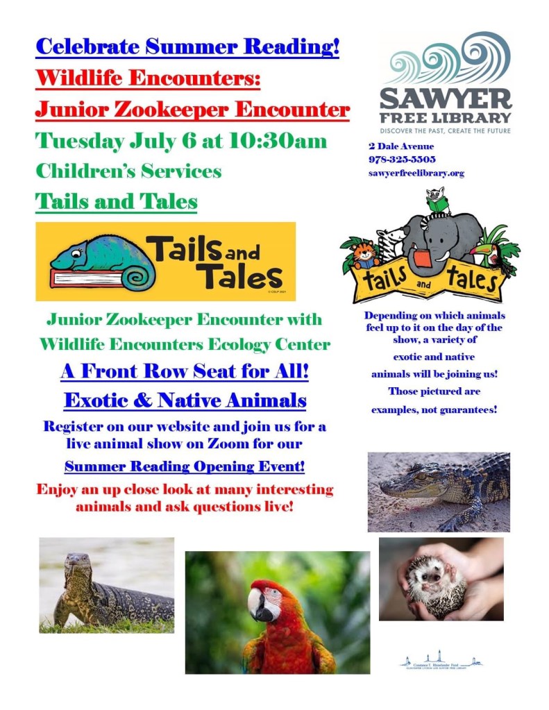 Sawyer Free Library Children’s Services to host a Summer Reading event July 6, 10AM featuring a Wildlife Encounters Ecology Center program.