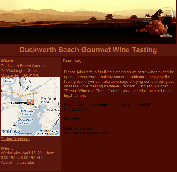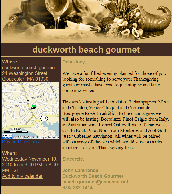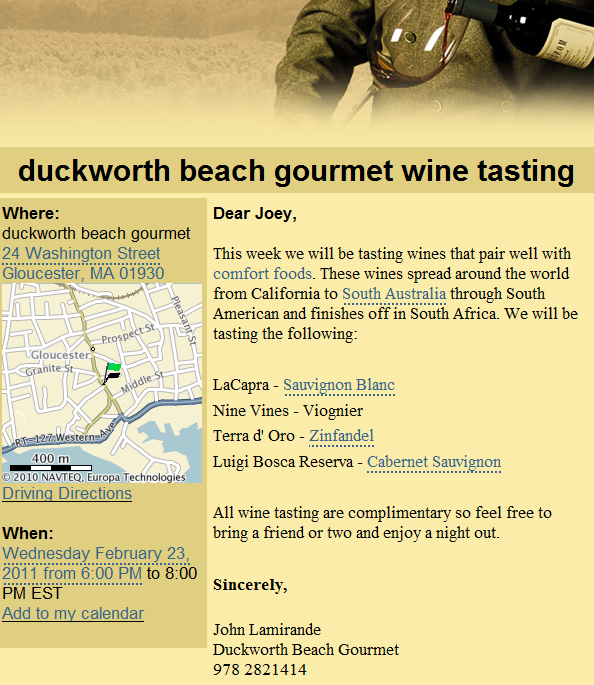 Joey — here are some details on our upcoming Food & Wine Tasting Fiesta coming up on May 7….
