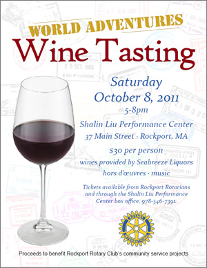 The Rotary Club of Rockport will hold one of its major fundraisers, a Wine Tasting at the new Shalin Liu Performance Center, on Saturday, October 16th. The event, from 5:00-8:00pm, will feature live entertainment, hors d’oeuvres and over 100 wines to sample. Tickets are available for $30 from any Rockport Rotarian, or through the Performance Center box office at 978-546-7391 x102, and on their website at www.rockportmusic.org. Wines are provided by Seabreeze Liquors of Gloucester.