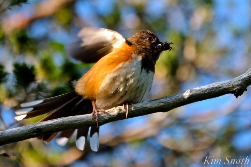 I have been hoping to take a photo of a female Eastern Towhee, and here she is, with a mouthful of breakfast for the nestlings! She hopped from tree limb to tree limb with her treasure, ta-weeting all the while; no small accomplishment while tightly clamping down on that big bug.