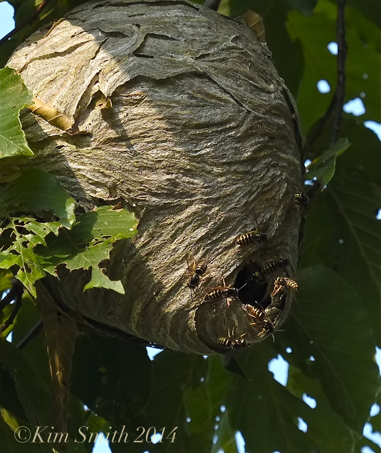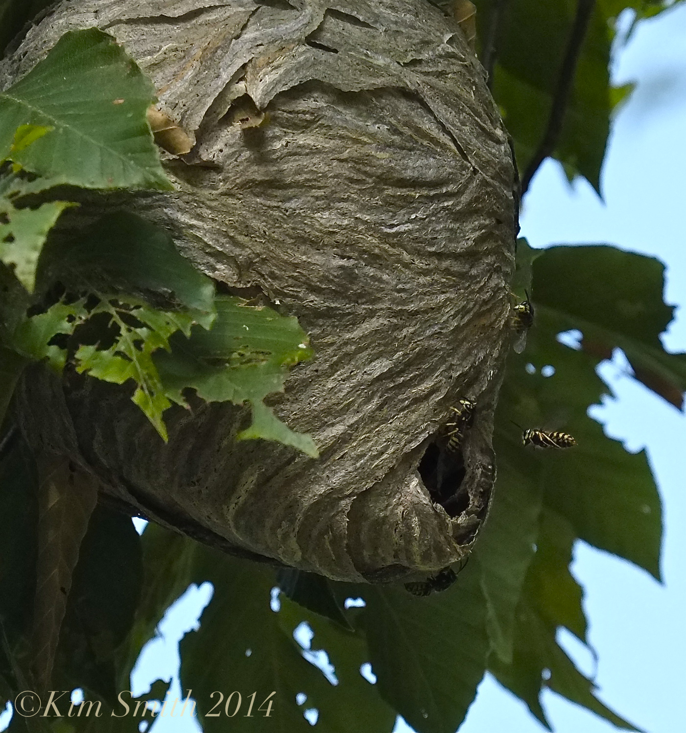 Recently at one of my landscape design project sites, which is located within a public space, a very distraught woman approached exclaiming that there was a wasp nest in a tree down the road aways. She was sure it needed to be destroyed, despite that it was at least 30 feet high up in the tree and not any where near where guests might wander. I calmly explained to her that the tree was not in my jurisdiction and even if it was, my first impulse would not be to destroy the nest. I thought it best to learn more about wasps in case there were more calls for its annihilation and after she left, I photographed the nest. I was glad she had pointed it out because it was so interesting to observe the rhythms of the comings and goings of the wasps, which after looking at the images through my camera’s lens, determined that it was the nest of the Aerial Yellowjacket (Dolichovespula arenaria).