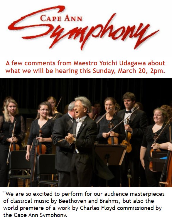 Founded in Gloucester in 1952, the Cape Ann Symphony is a professional orchestra of over 70 players from throughout the New England area. They perform a subscription season of four concerts per year plus several Pops and youth concerts. The Symphony Board of Directors named Yoichi Udagawa the Music Director and Conductor of the Cape Ann Symphony in the summer of 2000 after a yearlong search. In addition to his leadership of Cape Ann Symphony, he is Music Director and Conductor of the Melrose Symphony Orchestra, and the Quincy Symphony Orchestra and a cover conductor at the Boston Pops Orchestra. Frequently invited to guest conduct, Maestro Udagawa has worked with many different orchestras including the Boston Pops Esplanade Orchestra, Nobeoka Philharmonic Orchestra, the Pro Arte Chamber Orchestra of Boston, the University of Texas Symphony Orchestra, the Indian Hill Symphony, the Garden State Philharmonic, the Brown University Orchestra, the Syracuse Society for New Music, the Boston Conservatory Orchestra, the Midcoast Symphony Orchestra, the Newton Symphony, the Austin Civic Orchestra, and the Mid-Texas Symphony. Maestro Udagawa is at home in popular and contemporary music as well as the standard symphonic repertoire. He is known for his relaxed manner and ability to speak from the podium which has helped new audiences as well as enthusiasts gain a greater appreciation for symphonic music. His programs often include premieres of new works – some specially commissioned for the orchestra — as well as great orchestral works across the symphonic repertoire and lively Pops programs. He is also an integral part of the Cape Ann Symphony Youth Initiative.