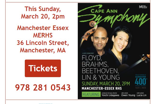 The Cape Ann Symphony Season 74 Opening Concert, The Virtuoso Orchestra! is Sunday, September 28, 2025 at 2:00 pm at the Manchester-Essex Regional High School Auditorium on 36 Lincoln Street, Manchester-by-the-Sea, MA. Manchester-Essex High School Auditorium is handicapped accessible. Ticket prices are $55 for adults, $50 for senior citizens, $20 for Students of any age with a valid student ID, $5 for Youth (12 years old and under). For information, call 978-281-0543 or visit www.capeannsymphony.org